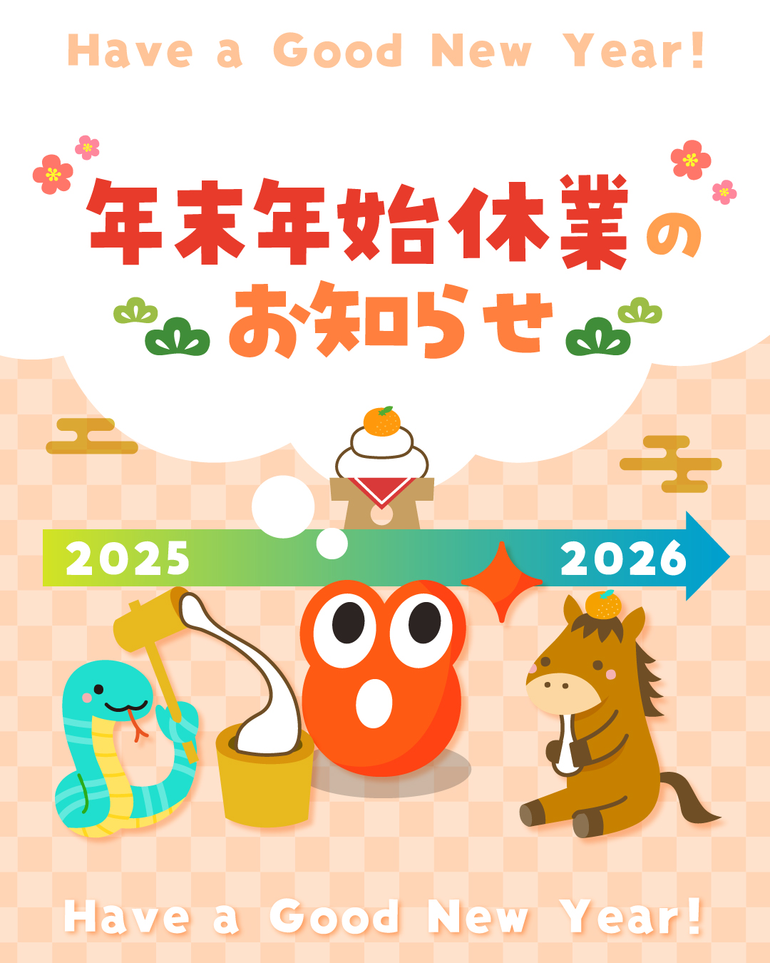 休業中のお電話・メールなどでいただきましたお問い合わせについては、1月5日(月)以降に順次対応させていただきますので、よろしくお願いたします。